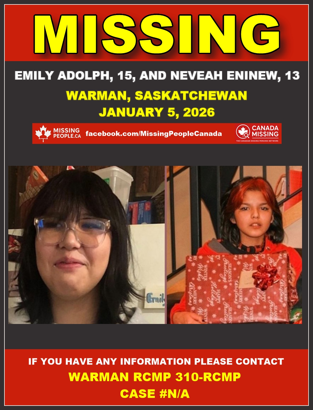 The Warman RCMP is seeking the public’s assistance in locating two missing girls, Emily Adolph, 15, and Neveah Eninew, 13. Emily and Neveah were last seen in Warman, SK on January 5, 2026. Investigators believe they may be together and may have travelled to the Saskatoon area, but their current whereabouts are unknown. Police are concerned for their wellbeing.