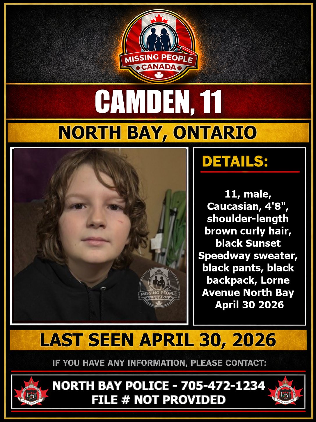 🚨 MISSING BOY ALERT – CAMDEN, 11 – LAST SEEN APRIL 30, 2026 IN NORTH BAY, ONTARIO
