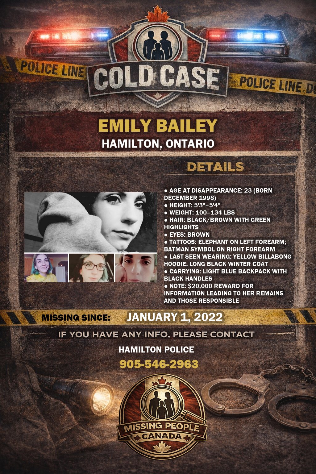 By March 2022, Hamilton Police confirmed the case was transferred to the Homicide Unit. Based on available evidence, investigators believe Emily was murdered and her remains hidden. In April 2022, police issued a release to dispel social media rumours of a serial killer linked to Emily’s case and others in the region. No such evidence was found.