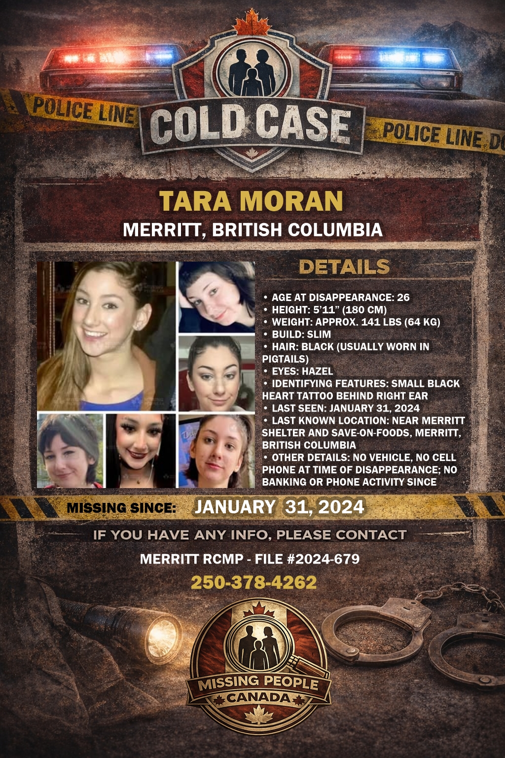 According to police and family, Tara was last seen on January 31, 2024, outside the Merritt shelter and nearby Save-On Foods. She did not own a vehicle or a cell phone at the time, and since that date, there has been no banking activity, phone use, or confirmed sightings.