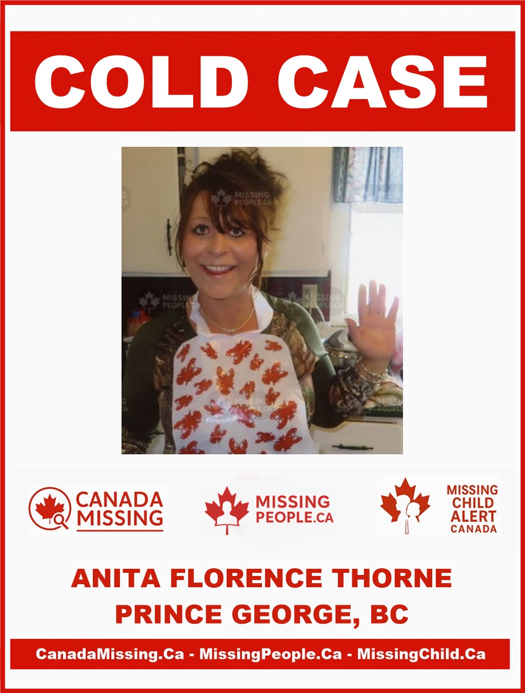 The Prince George RCMP is renewing its appeal to the public for assistance in the disappearance of Anita Florence Thorne, 49, who went missing on Wednesday, November 19, 2014. This case remains unsolved and is considered an ongoing investigation.