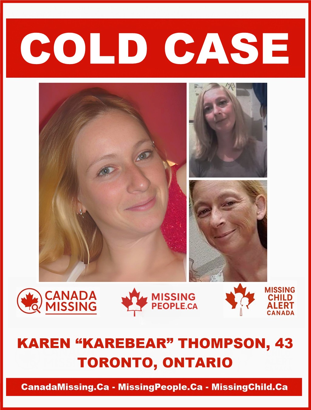 Karen lived in Etobicoke at the time of her disappearance, but she often moved between Dufferin County, Alliston, Scarborough, Oakville, and Hamilton. Her family describes her as a loving, strong-willed woman with a big heart and a protective nature. She was known affectionately as “Karebear.”