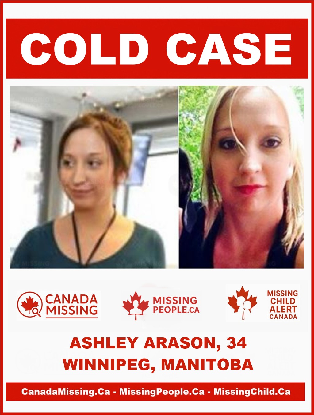 Anyone with information about Ashley Arason is urged to contact the Winnipeg Police Service Missing Persons Unit at (204) 986-6250. Tips can also be submitted anonymously through Crime Stoppers by calling (204) 786-8477 or 1-800-222-8477.
