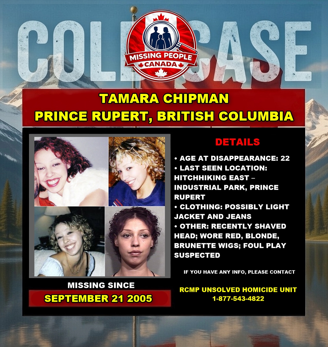 Tamara Lynn Chipman, 22, a member of the Wet’suwet’en Nation from Prince Rupert, British Columbia, disappeared on September 21, 2005, while hitchhiking east on Highway 16 toward Terrace. She was last seen near the industrial park just outside Prince Rupert. Her car had broken down weeks earlier and was awaiting repairs in Terrace. She had a court appearance in Terrace that day for assault charges. Family initially believed she was with the other parent, delaying the report until early November when her father Tom noticed unpaid rent and untouched bank account.