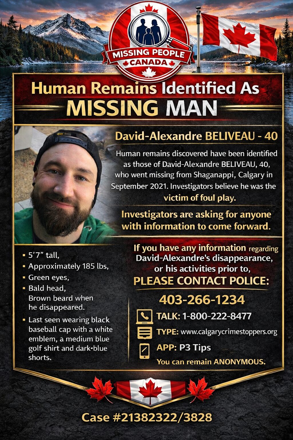 🚨 Human Remains Identified – David-Alexandre Béliveau, 40 – Missing from Calgary Since September 4 2021