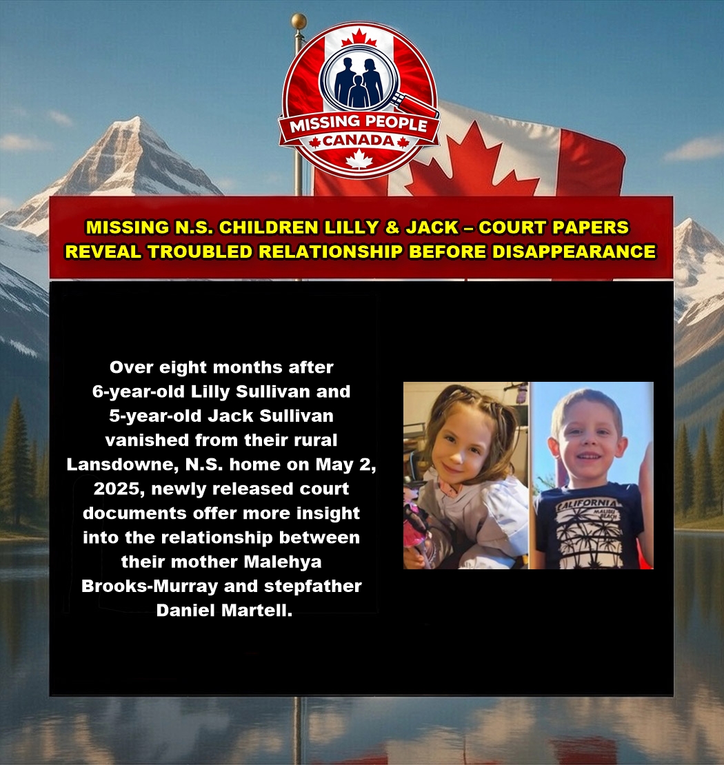 Newly released court records in the case of missing siblings Lilly Sullivan (6) and Jack Sullivan (5) from Lansdowne, Nova Scotia, provide additional context on the relationship between their mother Malehya Brooks-Murray and stepfather Daniel Martell in the lead-up to the children’s disappearance on May 2, 2025.