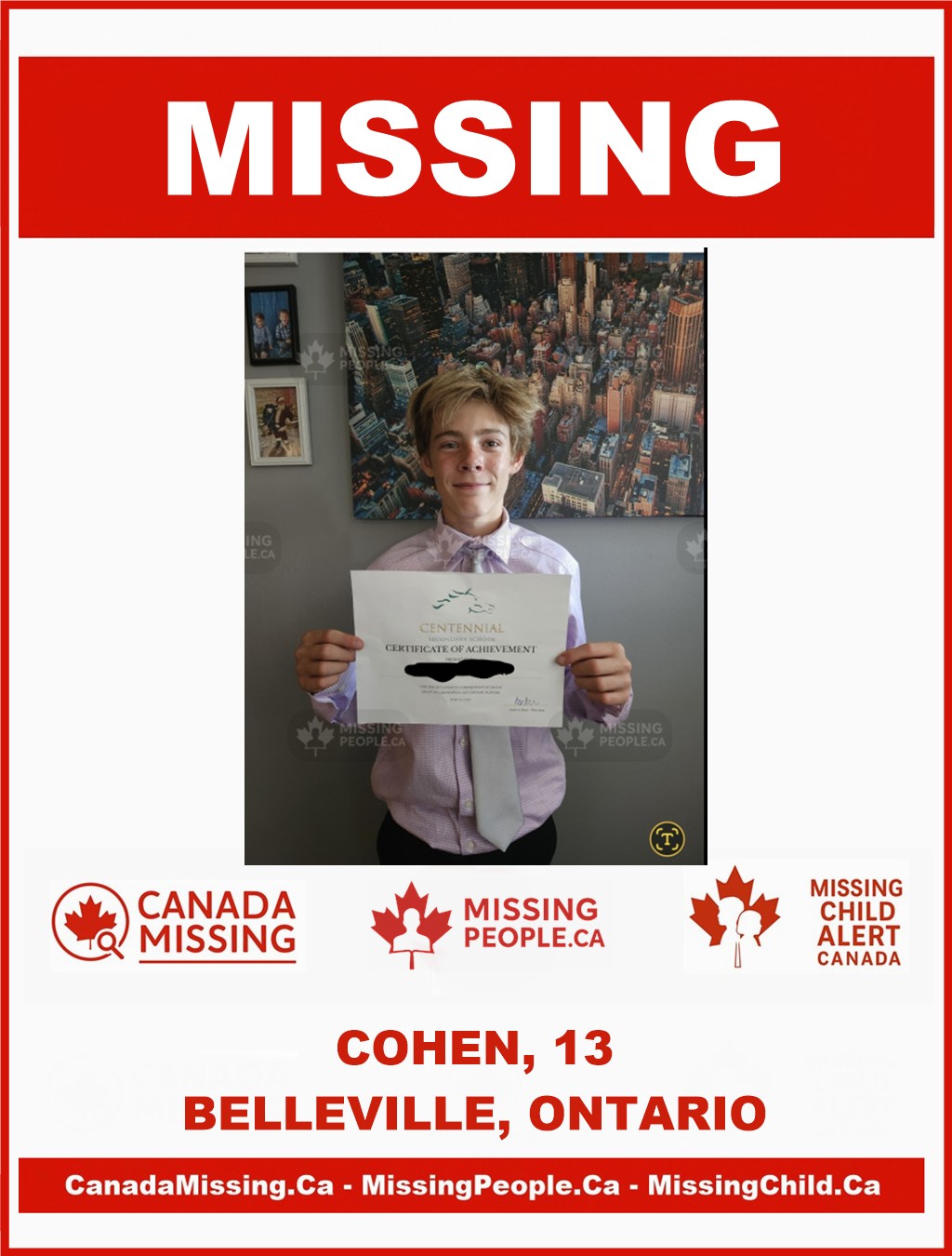 The Belleville Police Service is requesting the public’s assistance in locating 13-year-old Cohen, who has been reported missing.