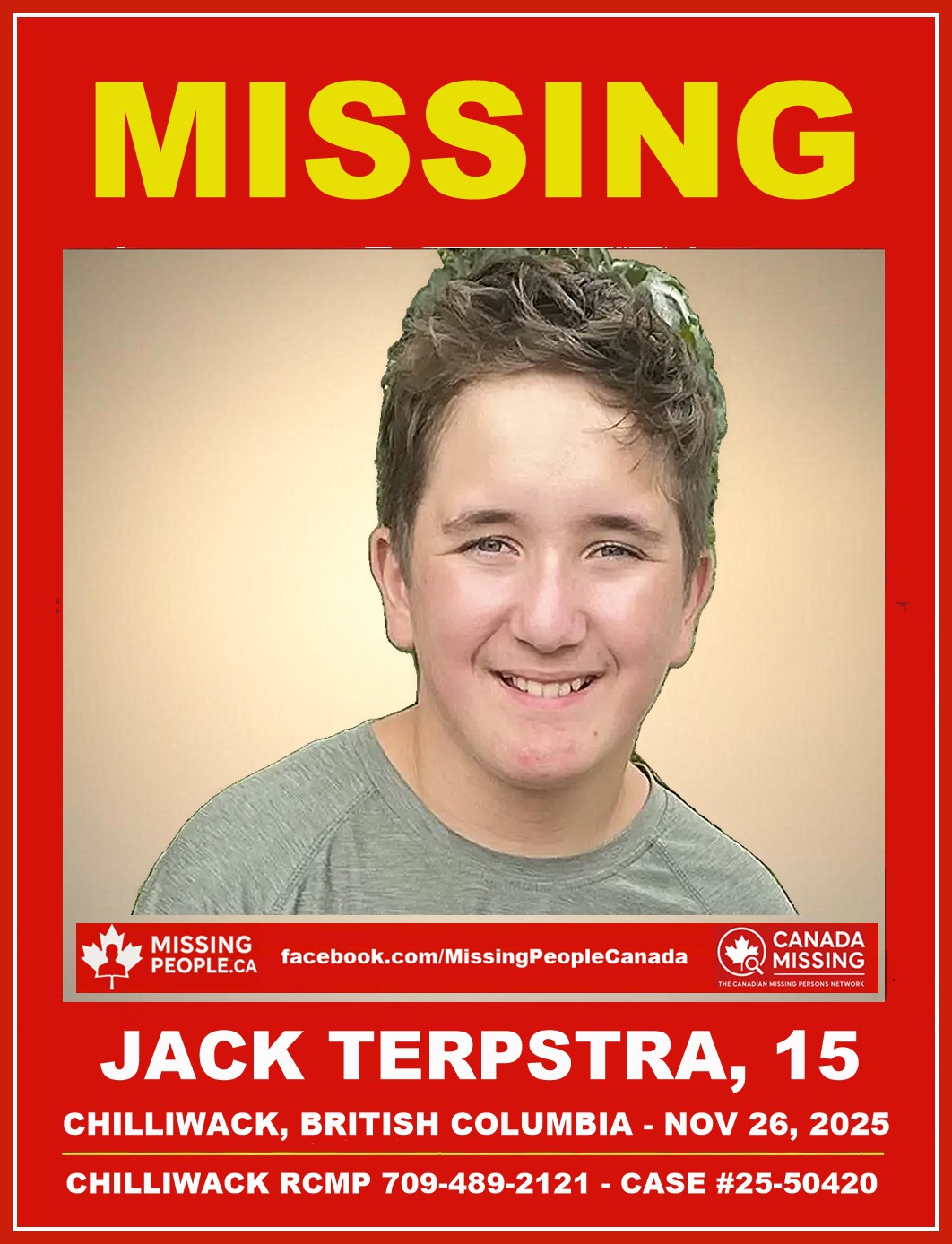 The Chilliwack RCMP is requesting the public’s assistance in locating Jack Terpstra, a 15-year-old boy from Chilliwack.