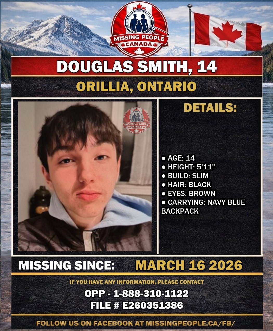 The Orillia OPP is requesting the public’s assistance locating missing boy Douglas Smith, 14. He was last seen on Monday, March 16, 2026 at 10:00 p.m. near Peter Street North in Orillia, Ontario. Friends and police are concerned for his well-being.