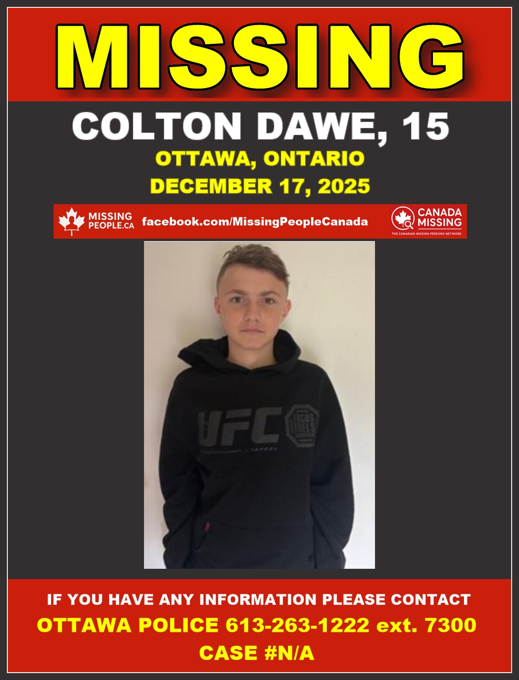 🚨 Missing Teen Boy in Ottawa, Ontario – Colton Dawe, 15 – Last Seen December 17 2025