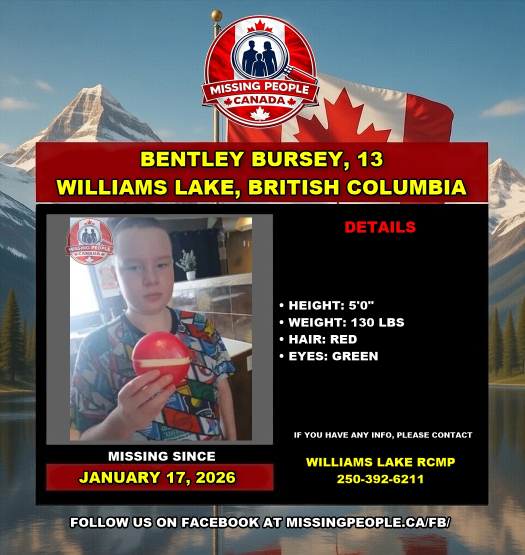 The Williams Lake RCMP are asking for the public’s assistance in locating a missing 13-year-old boy, Bentley Bursey. Bentley was last seen on Saturday, January 17, 2026, in Williams Lake. Police are concerned for his wellbeing.