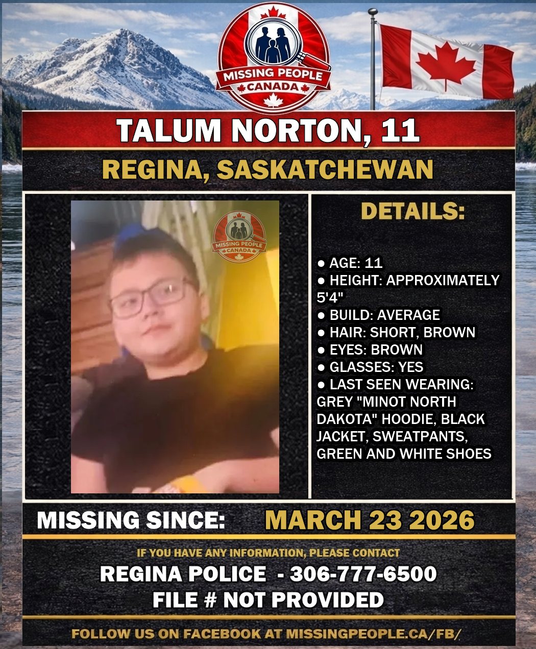 🚨 Missing Child in Regina, Saskatchewan – Talum Norton, 11 – Last Seen March 23 2026