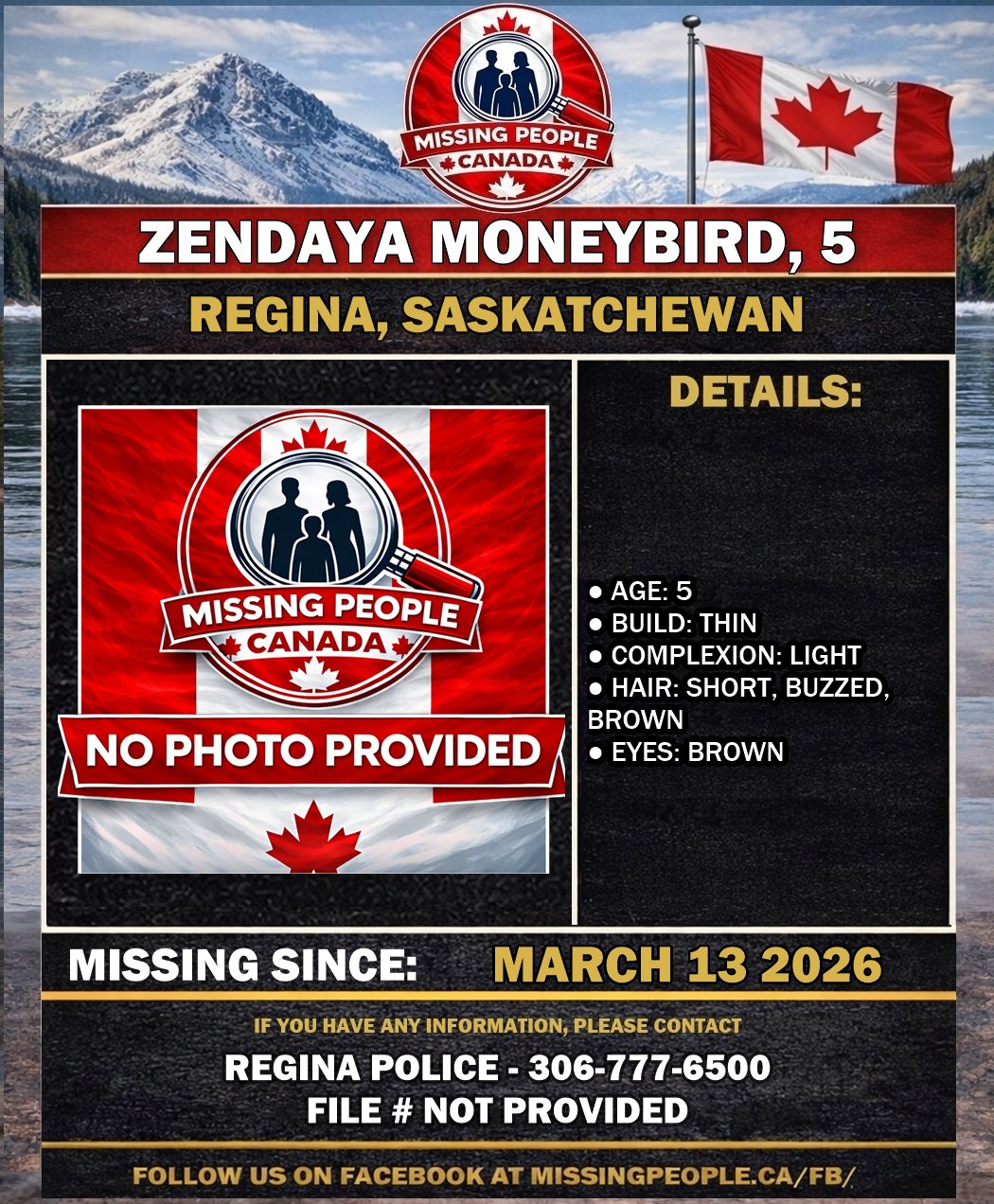 The Regina Police Service is requesting the public’s assistance locating missing child Zendaya Moneybird, 5. She was last seen on Friday, March 13, 2026 at approximately 3:40 p.m. in the 2300 block of Willow Road in Regina, Saskatchewan. There is no evidence that Zendaya has come to harm; however, she is considered at risk due to her age and police are concerned for her safety.