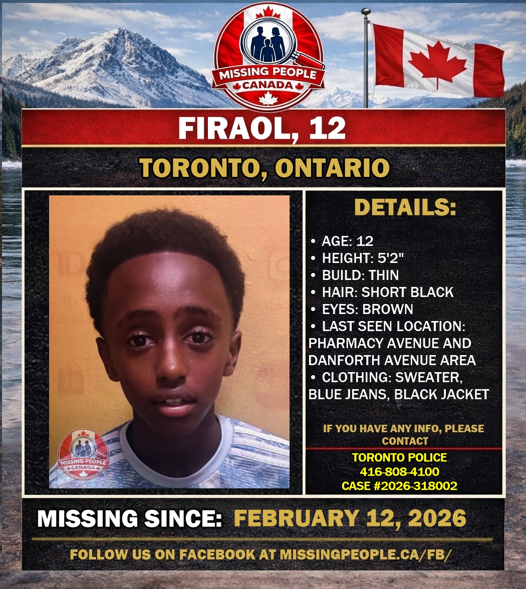 The Toronto Police Service is requesting the public’s assistance locating a missing child, Firaol, 12. Firaol was last seen on Thursday, February 12, 2026, at 3:20 p.m., in the Pharmacy Avenue and Danforth Avenue area. Police are concerned for their safety.