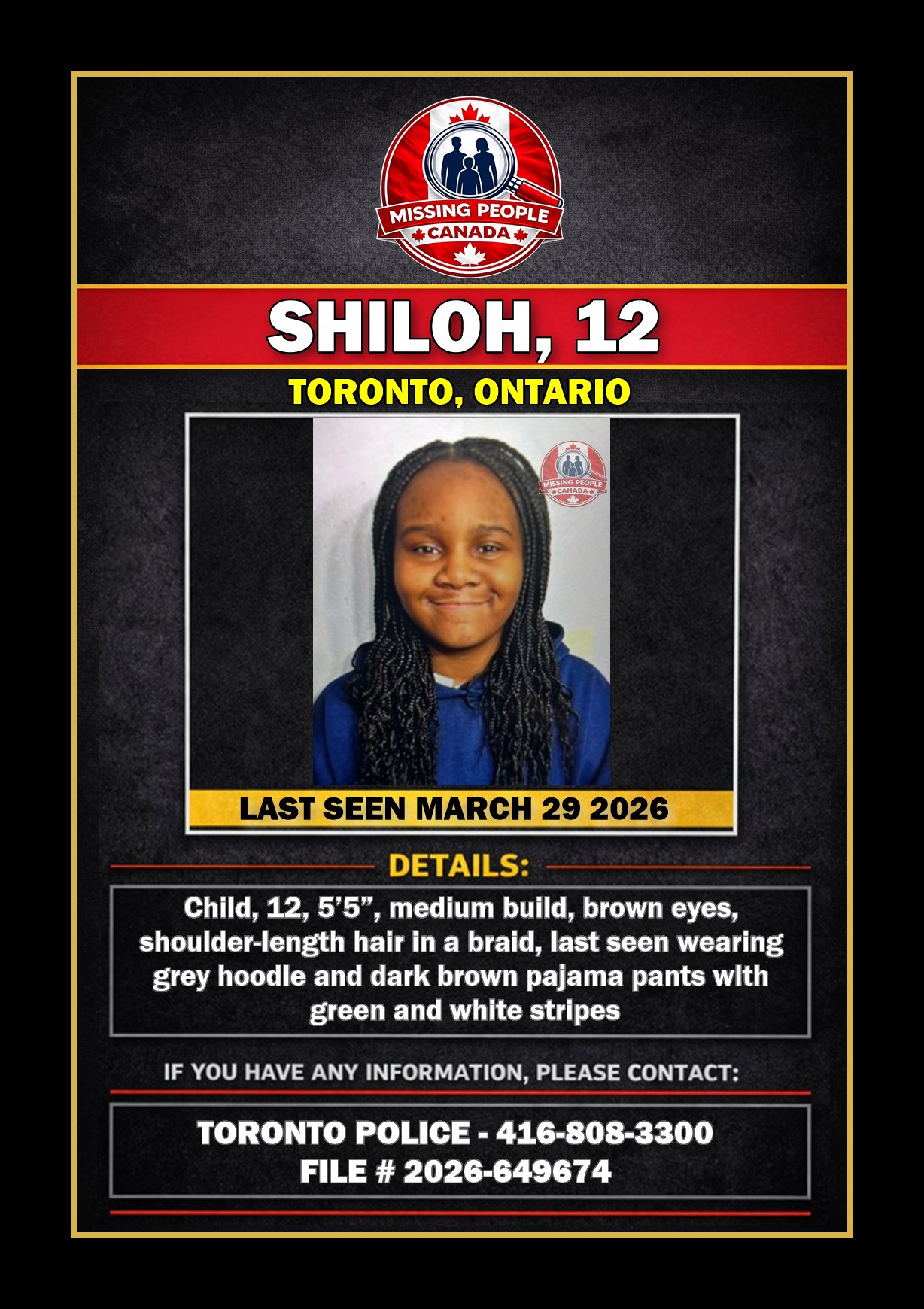 🚨 Missing child in Toronto – Shiloh, 12 – Last Seen March 29 2026