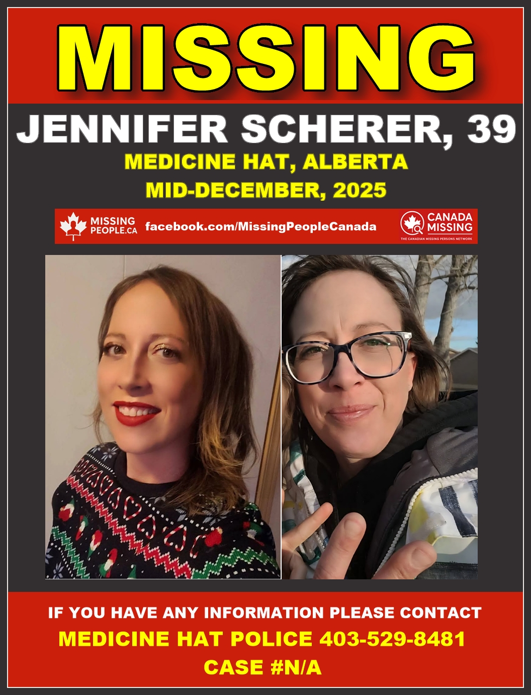 🚨 Missing Female in Medicine Hat, Alberta – Jennifer Scherer, 39 – Last Contact Mid-December 2025
