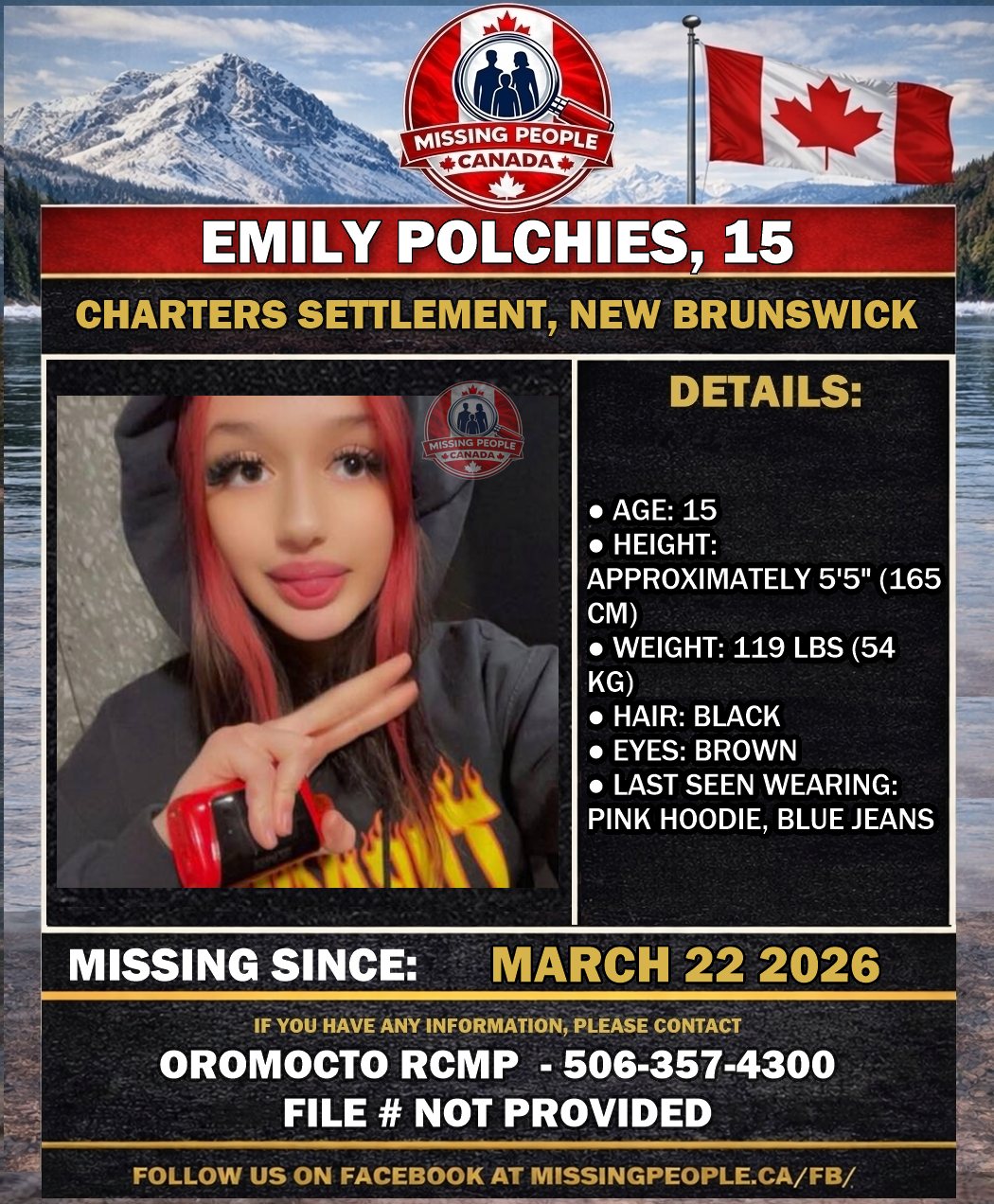 The OROMOCTO RCMP is requesting the public’s assistance locating missing girl Emily Polchies, 15, from Charters Settlement, New Brunswick. She was last seen on Sunday, March 22, 2026 at approximately 11:30 p.m. near Charters Settlement. She was reported missing to police on March 23. Police have followed up on several leads but have so far been unable to locate her. Police and her family are concerned for her well-being.