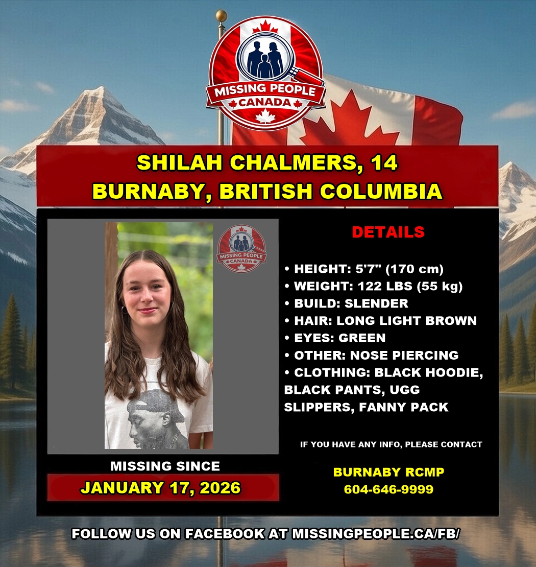 The Burnaby RCMP is seeking public assistance in locating a missing 14-year-old girl, Shilah Chalmers. Shilah was last seen on January 17, 2026, at 12:00 p.m.. RCMP are concerned for her wellbeing.