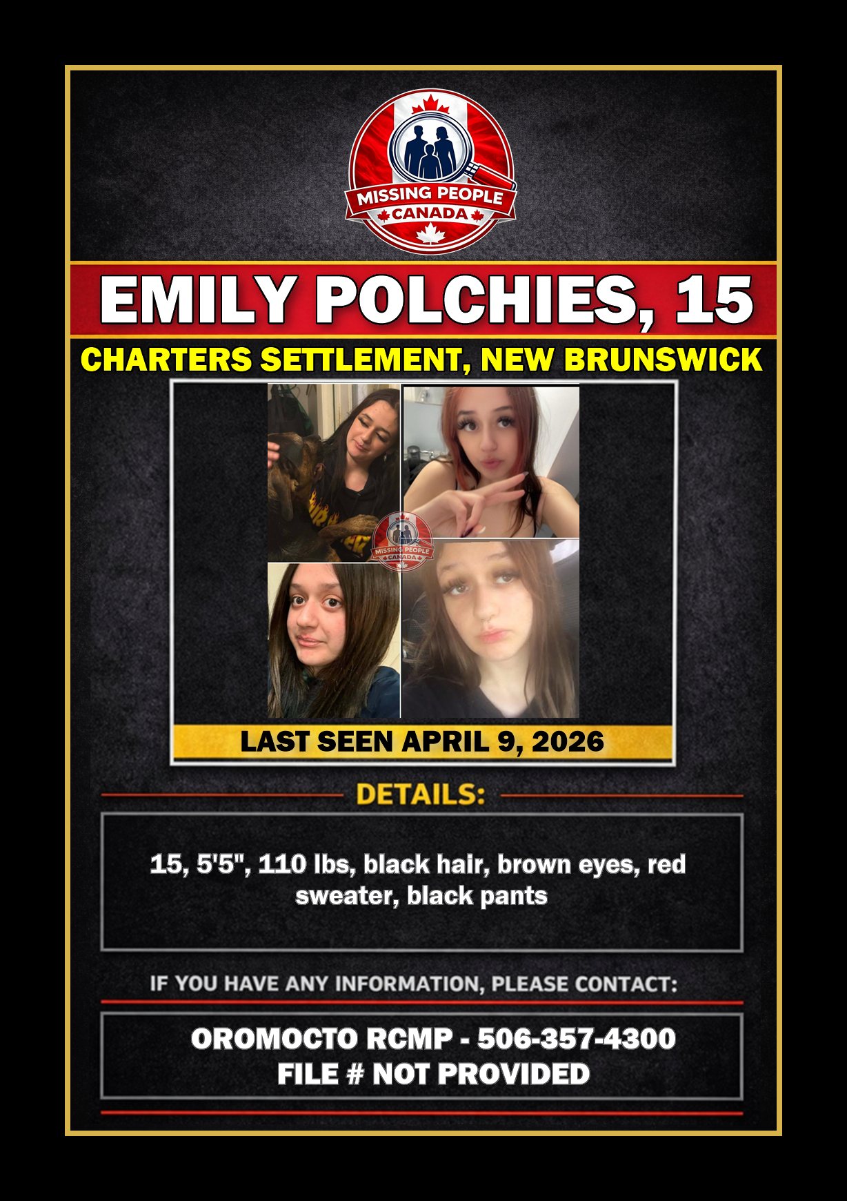 🚨 MISSING GIRL IN CHARTERS SETTLEMENT, NEW BRUNSWICK – EMILY POLCHIES, 15 – LAST SEEN APRIL 9, 2026