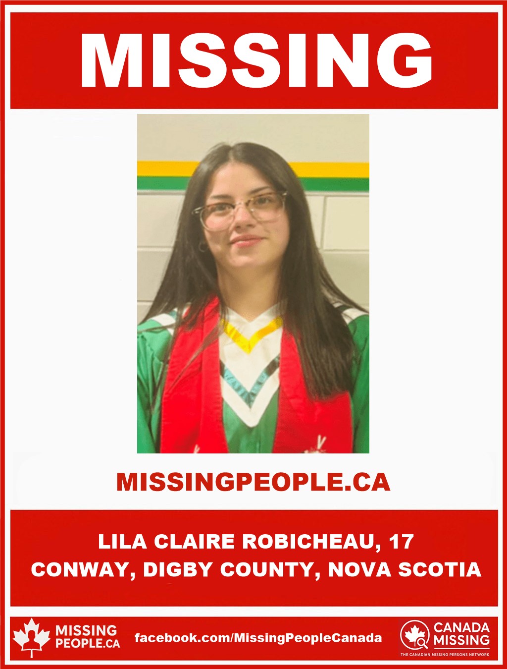 The Digby RCMP Detachment is asking for the public’s assistance in locating 17-year-old Lila Claire Robicheau, who was last seen on November 9, 2025, in Conway, Digby County, Nova Scotia.