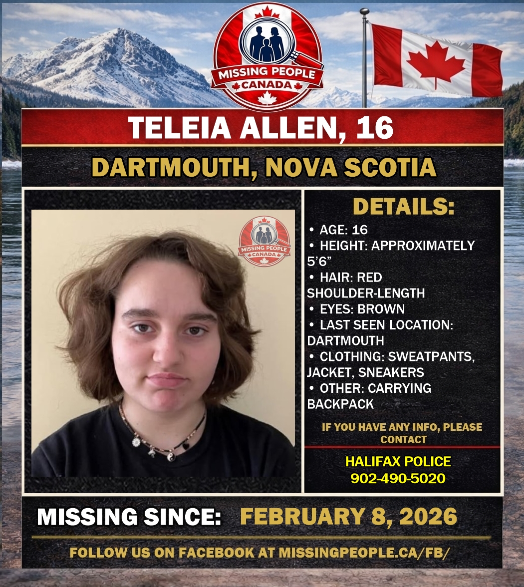 The Halifax Regional Police is seeking the public’s assistance in locating a missing 16-year-old girl, Teleia Allen. Teleia was last seen on February 8, 2026. Police are concerned for her wellbeing.