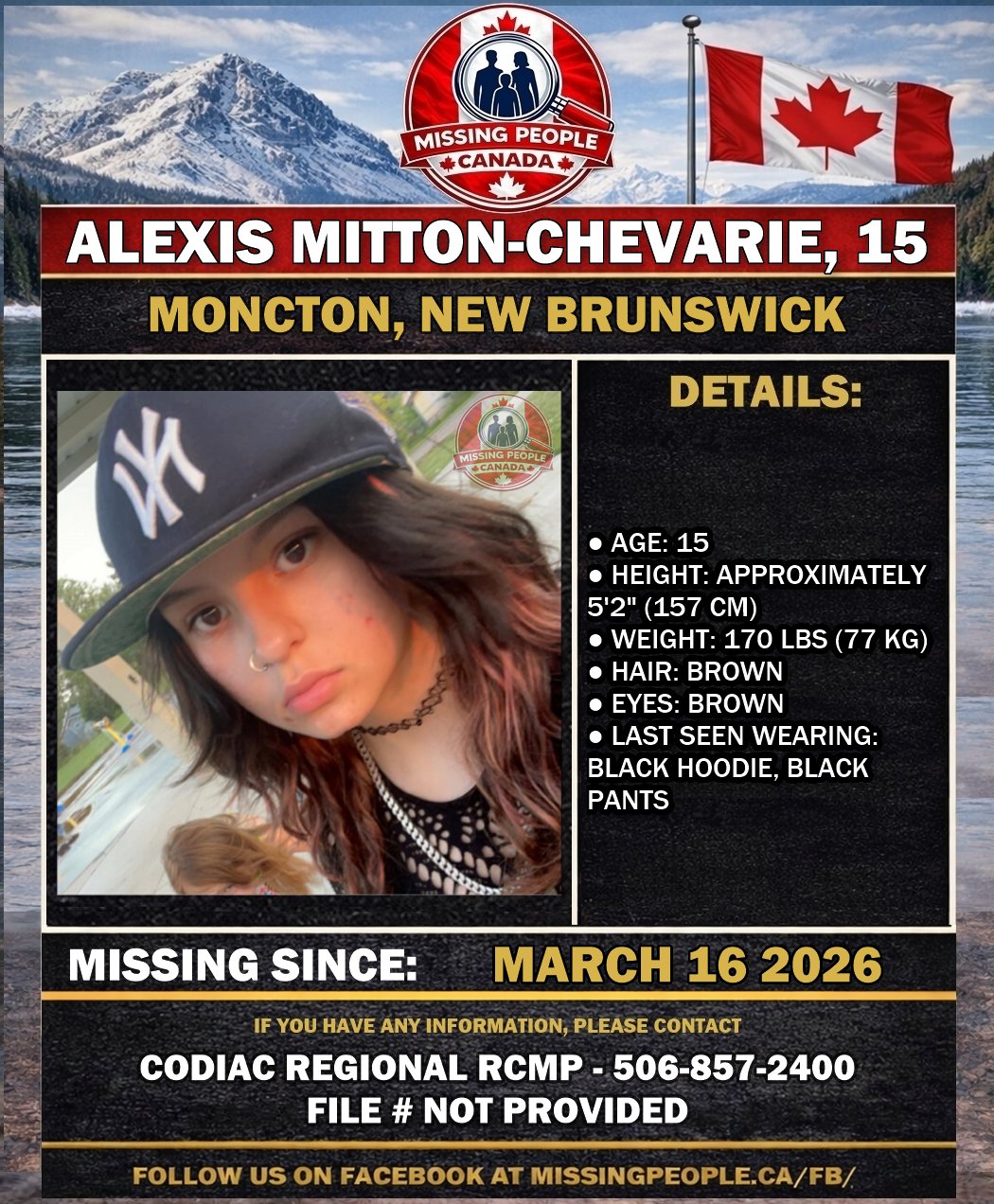 The Codiac Regional RCMP is requesting the public’s assistance locating missing girl Alexis Mitton-Chevarie, 15, from Moncton, New Brunswick. She was last seen on Sunday, March 16, 2026 at approximately 5:25 p.m. near Snow Avenue in Moncton. She was reported missing to police the same day. Police have followed up on several leads but have so far been unable to locate her. Police and her family are concerned for her well-being.