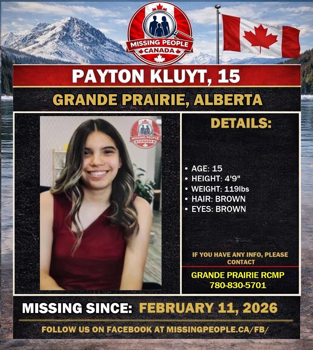 The Grande Prairie RCMP is asking for the public’s assistance in locating a missing 15-year-old girl, Payton Kluyt. Payton was last seen on February 11, 2026, in Grande Prairie. Police are concerned for her well-being.