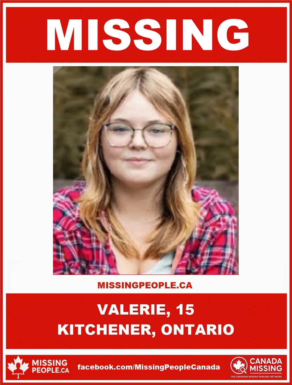 If you have information regarding Valerie’s whereabouts, please contact police or provide an anonymous tip through Waterloo Crime Stoppers.