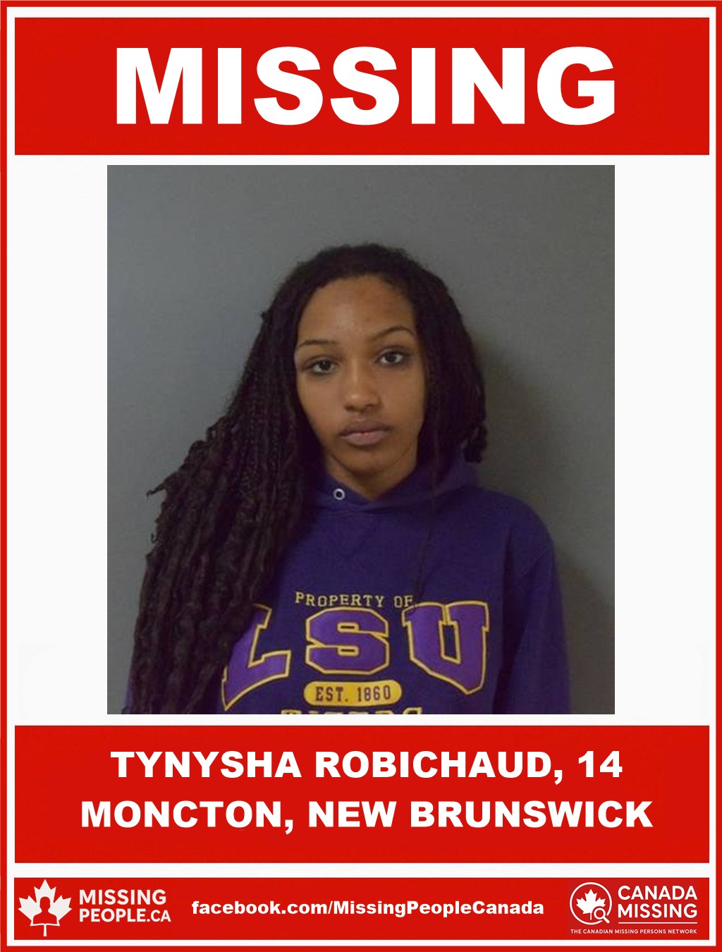 The Codiac Regional RCMP is asking for the public’s assistance in locating 14-year-old Tynysha Robichaud, from Moncton, New Brunswick.