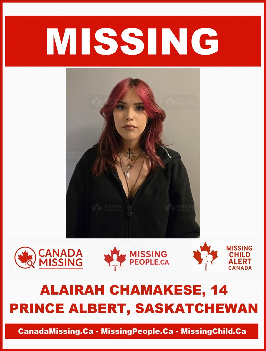 The Prince Albert Police Service is requesting the public’s assistance in locating 14-year-old Alairah Chamakese. She was last seen at approximately 8:15 a.m. on October 3, 2025, in the 700 block of 28th Street East in Prince Albert, Saskatchewan.