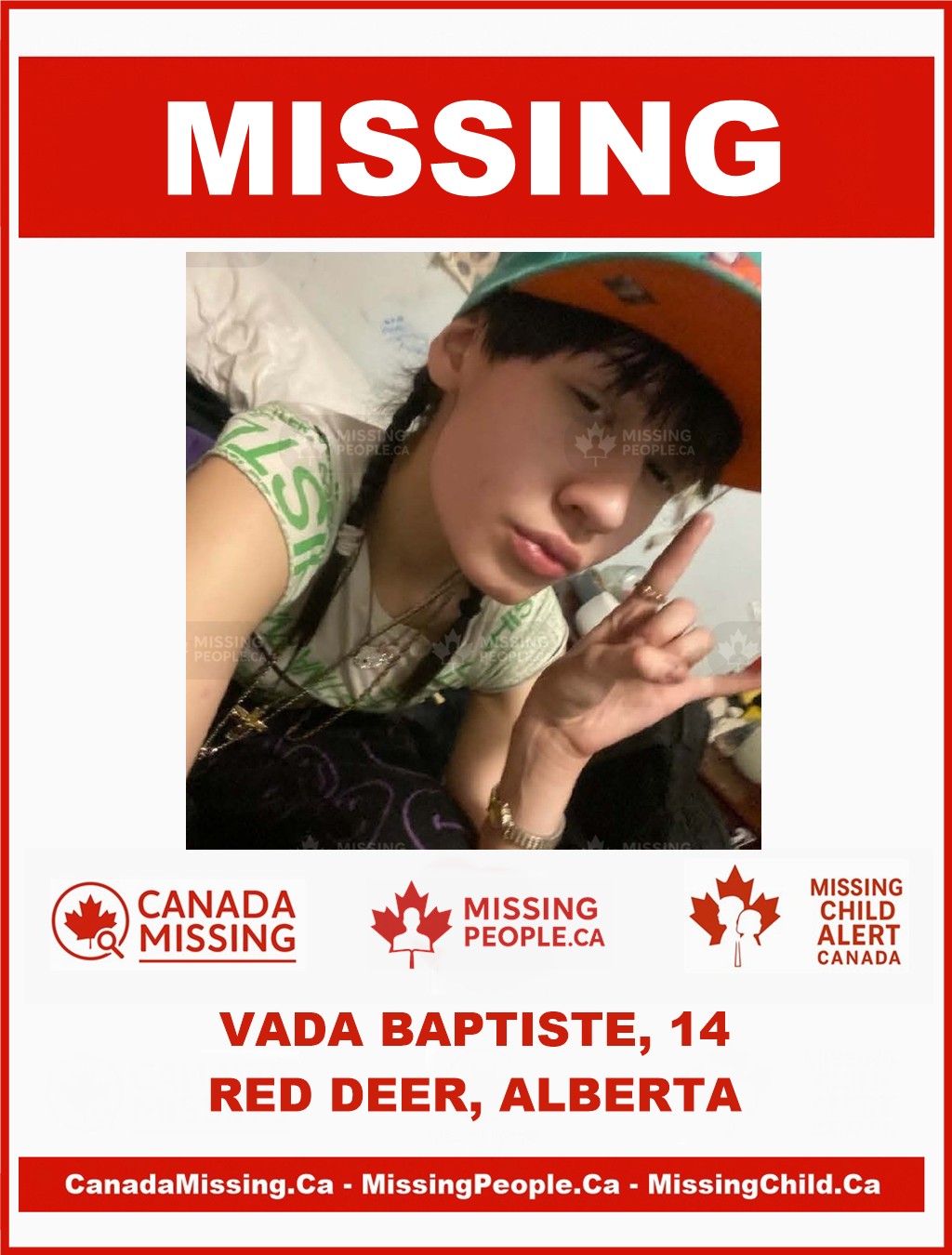 If you have any information regarding the whereabouts of Vada Baptiste, please contact the Red Deer RCMP at 403-406-2200, or your local police service.