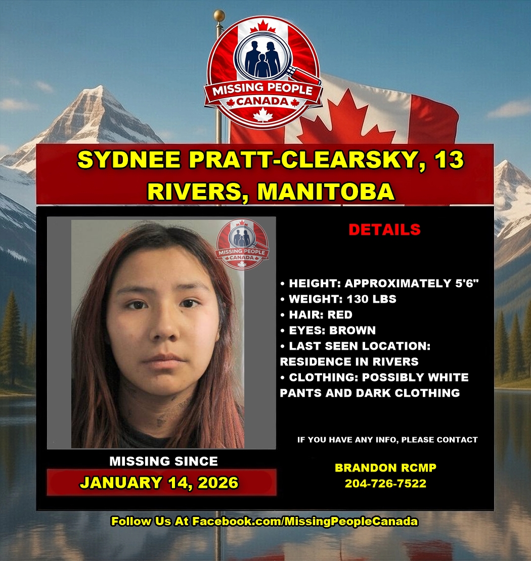 The Brandon RCMP is seeking the public’s assistance in locating a missing 13-year-old girl, Sydnee Pratt-Clearsky. Sydnee was last seen at a residence in Rivers, Manitoba, around 3 a.m. on January 14, 2026. RCMP are concerned for her safety.