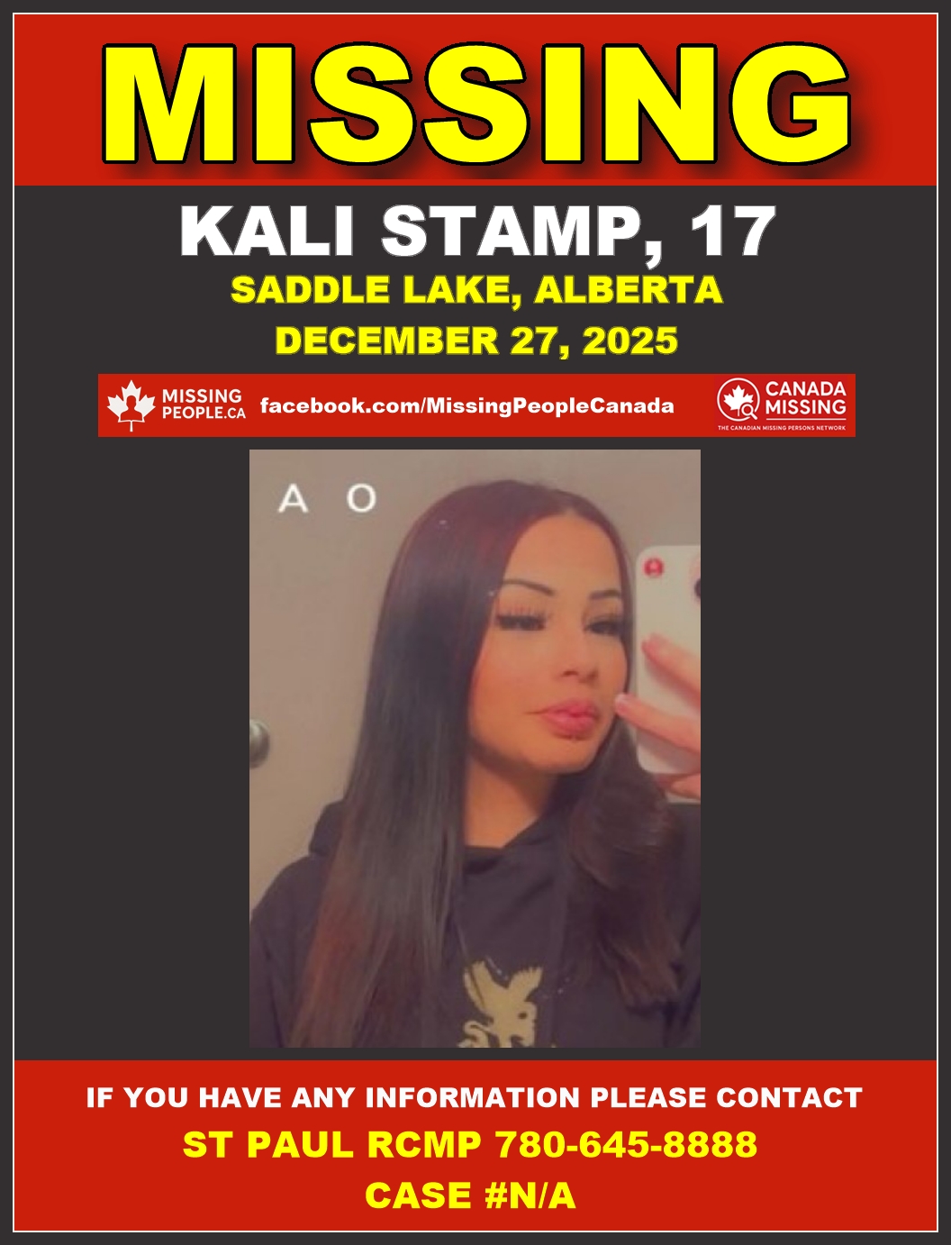The public is asked to assist in locating a missing 17-year-old girl, Kali Stamp, last seen in Saddle Lake, Alberta on December 27, 2025. We are concerned for her safety.