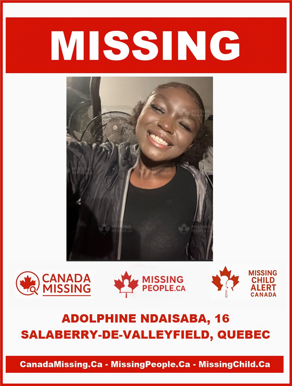 The Sûreté du Québec is seeking public assistance in locating 16-year-old Adolphine Ndaisaba from Salaberry-de-Valleyfield, Quebec.