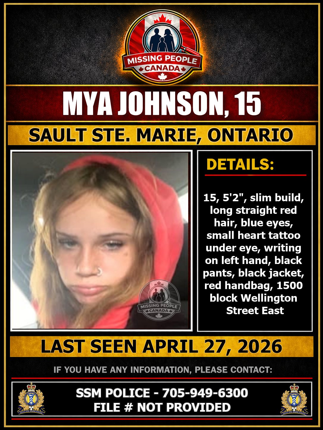 Mya was last seen around 11:06 p.m. on April 27, 2026 in the 1500 block of Wellington Street East wearing black pants, a black jacket, and carrying a red handbag.