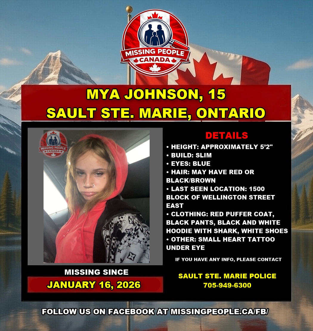 The Sault Ste. Marie Police Service is seeking the community’s assistance in locating a missing 15-year-old girl, Mya Johnson. Mya was last seen around 5:45 p.m. on January 16, 2026, in the 1500 block of Wellington Street East. Police are concerned for her wellbeing.