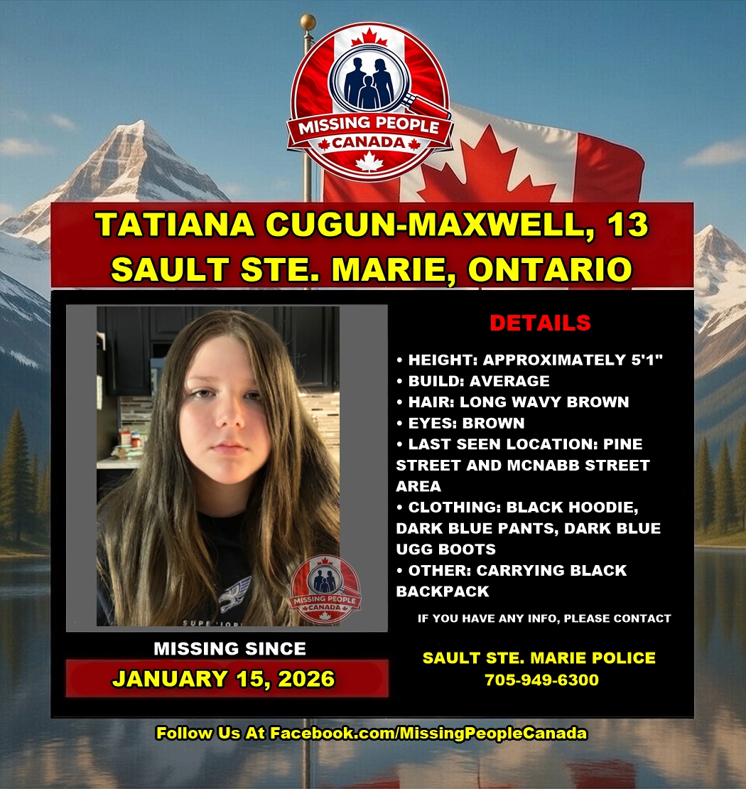 The Sault Ste. Marie Police Service is seeking the community’s assistance in locating a missing 13-year-old girl, Tatiana Cugun-Maxwell. Tatiana was last seen around 9:30 a.m. on January 15, 2026, in the area of Pine Street and McNabb Street. Police are concerned for her wellbeing.