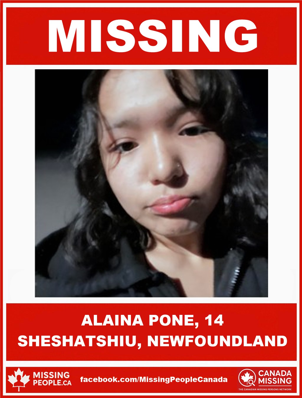 The Sheshatshiu RCMP is seeking the public’s assistance in locating 14-year-old Alaina Pone, who has been reported missing from Sheshatshiu, Newfoundland.