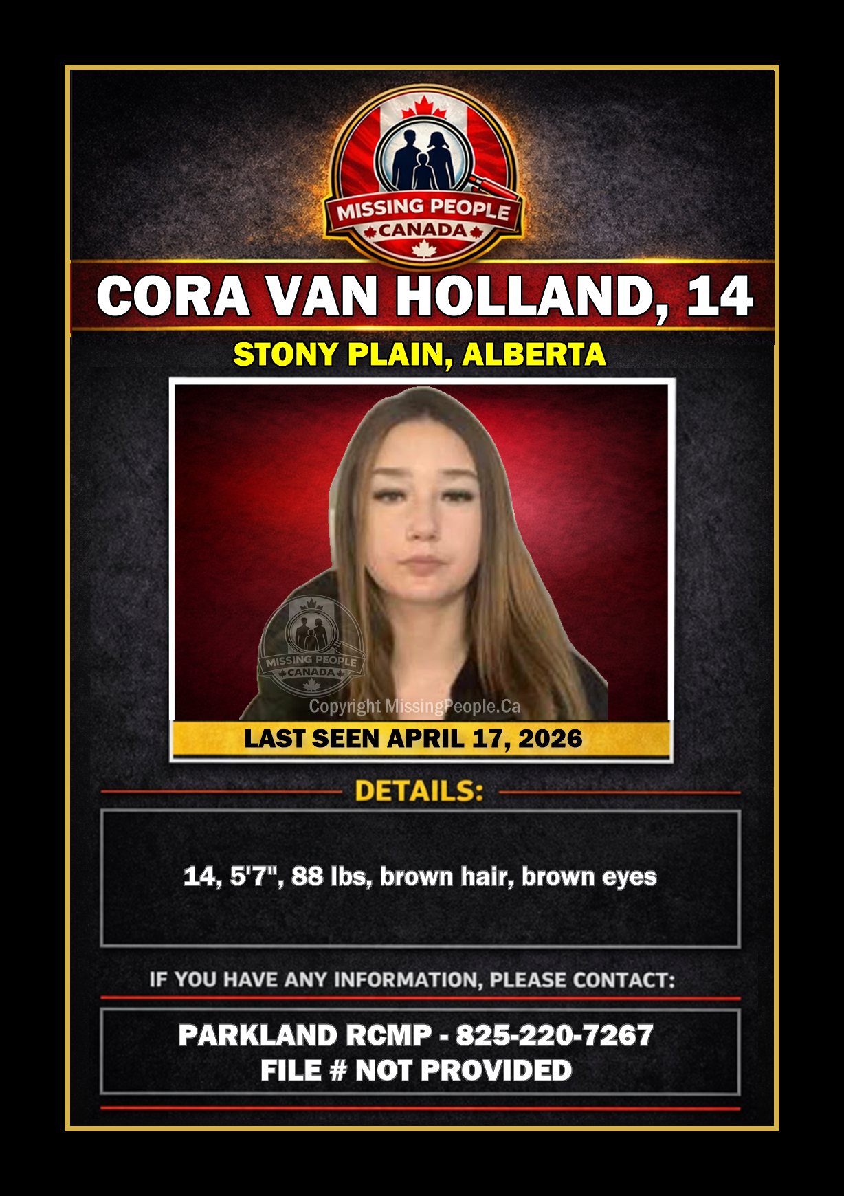 MISSING GIRL IN STONY PLAIN, ALBERTA – CORA VAN HOLLAND, 14 – LAST SEEN APRIL 17, 2026