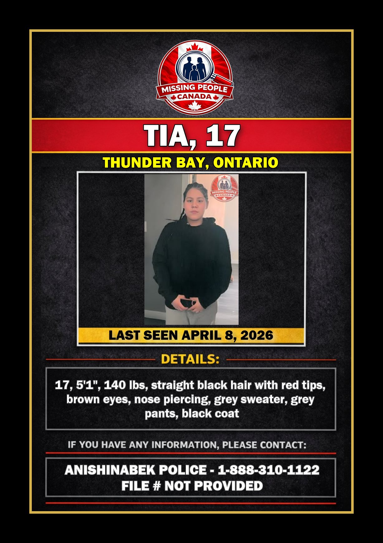 Tia (17) was last seen in the area of Windsor St. in Thunder Bay on April 8, 2026. Efforts to confirm her whereabouts have been unsuccessful.