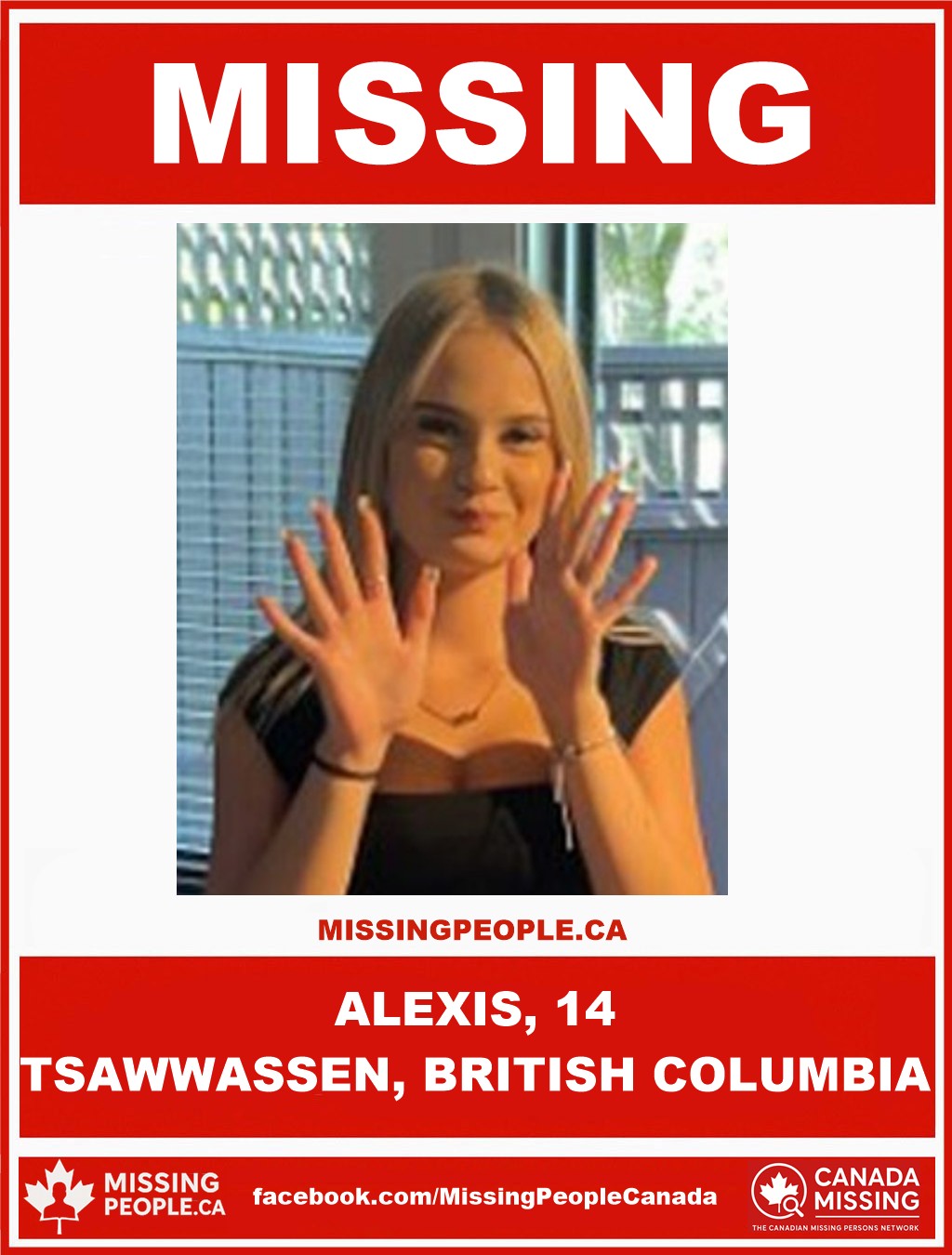 The Delta Police Department (DPD) is requesting the public’s assistance in locating Alexis, a 14-year-old girl from Tsawwassen.