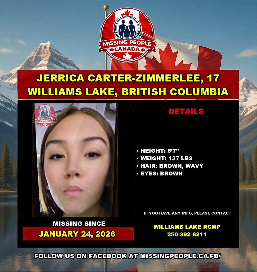 Anyone who has seen Jerrica Carter-Zimmerlee or has information on her whereabouts is urged to contact the Williams Lake RCMP at 250-392-6211.