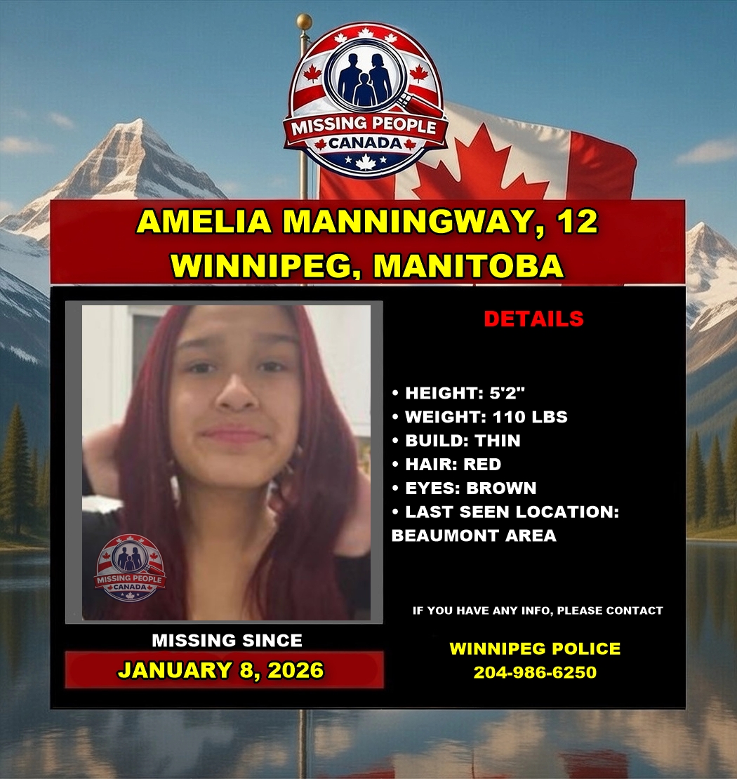 The Winnipeg Police Service Missing Persons Unit is requesting assistance in locating a missing 12-year-old girl, Amelia Manningway. Amelia was last seen in the afternoon on January 8, 2026, in the Beaumont area of Winnipeg. Police are concerned for her wellbeing.