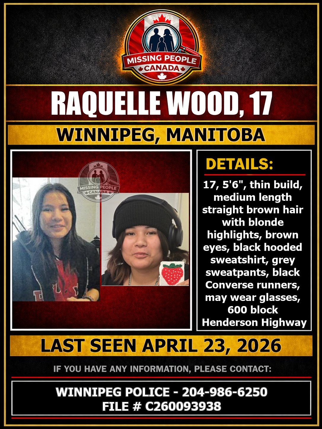 - Last Seen: April 23, 2026 at 7:00 p.m. in the 600 block of Henderson Highway, Winnipeg