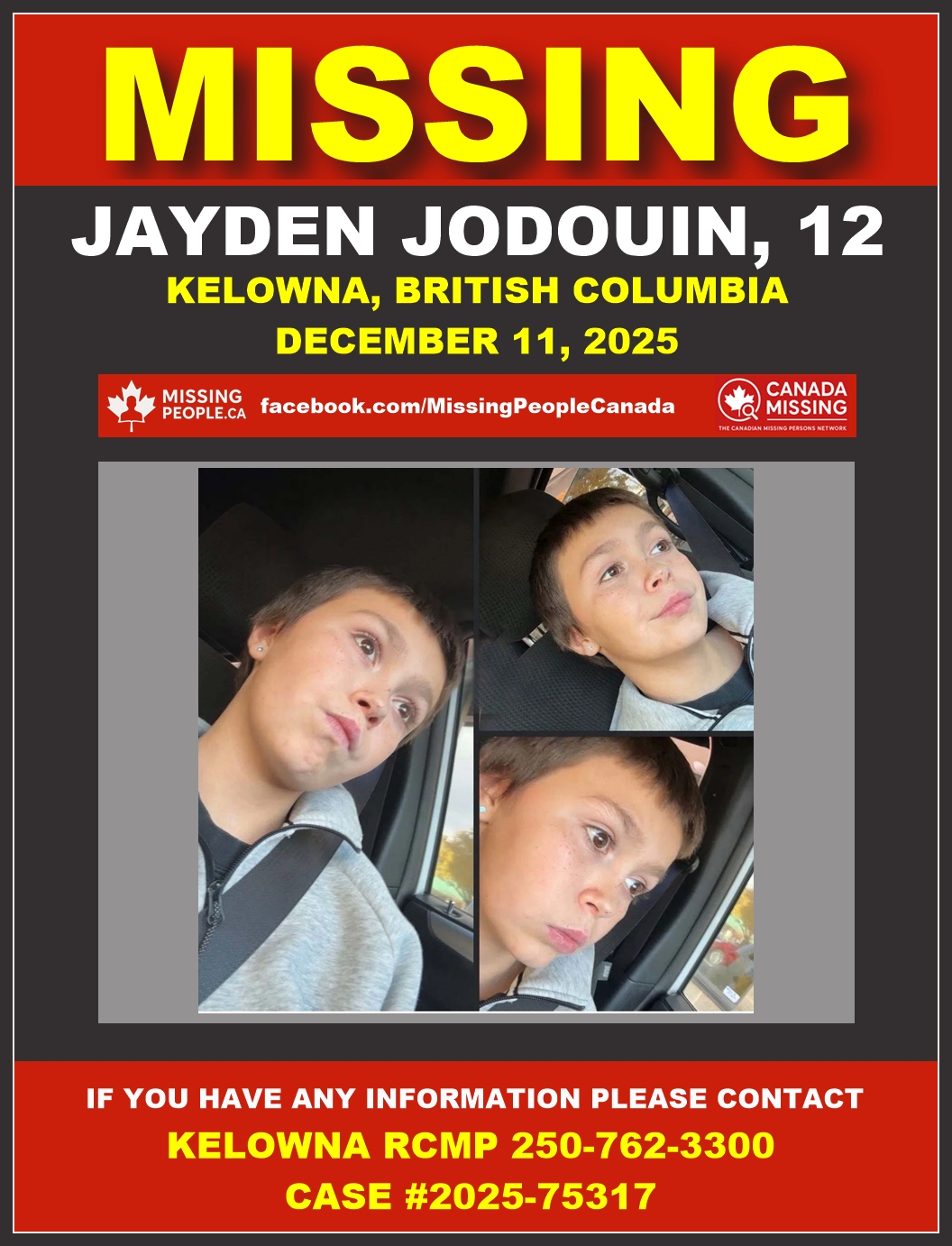 Anyone with information on Jayden’s whereabouts is asked to contact Kelowna RCMP at 250-762-3300 and reference file #2025-75317. Anonymous tips to Crime Stoppers at 1-800-222-8477.