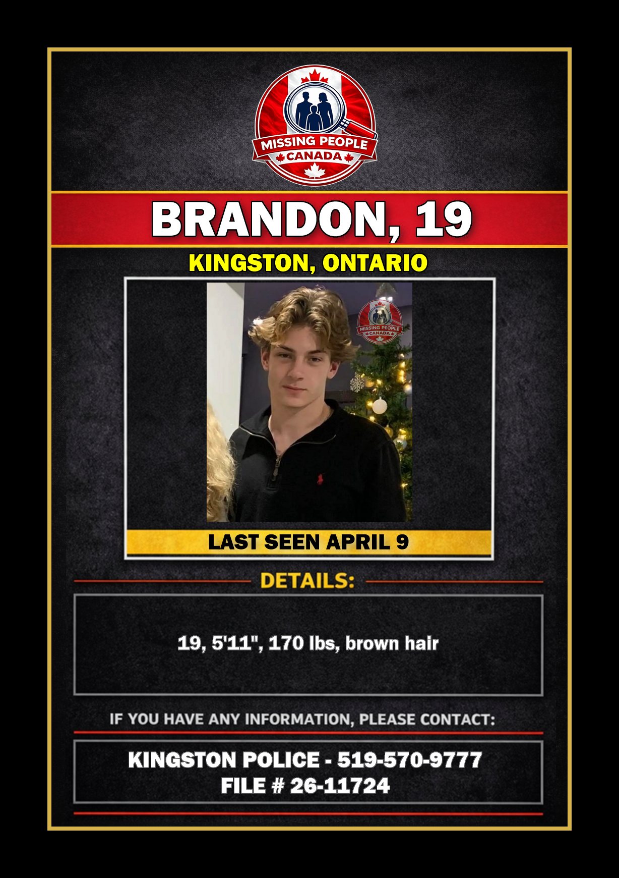 🚨 MISSING MALE IN KINGSTON, ONTARIO – BRANDON, 19 – LAST SEEN APRIL 9, 2026