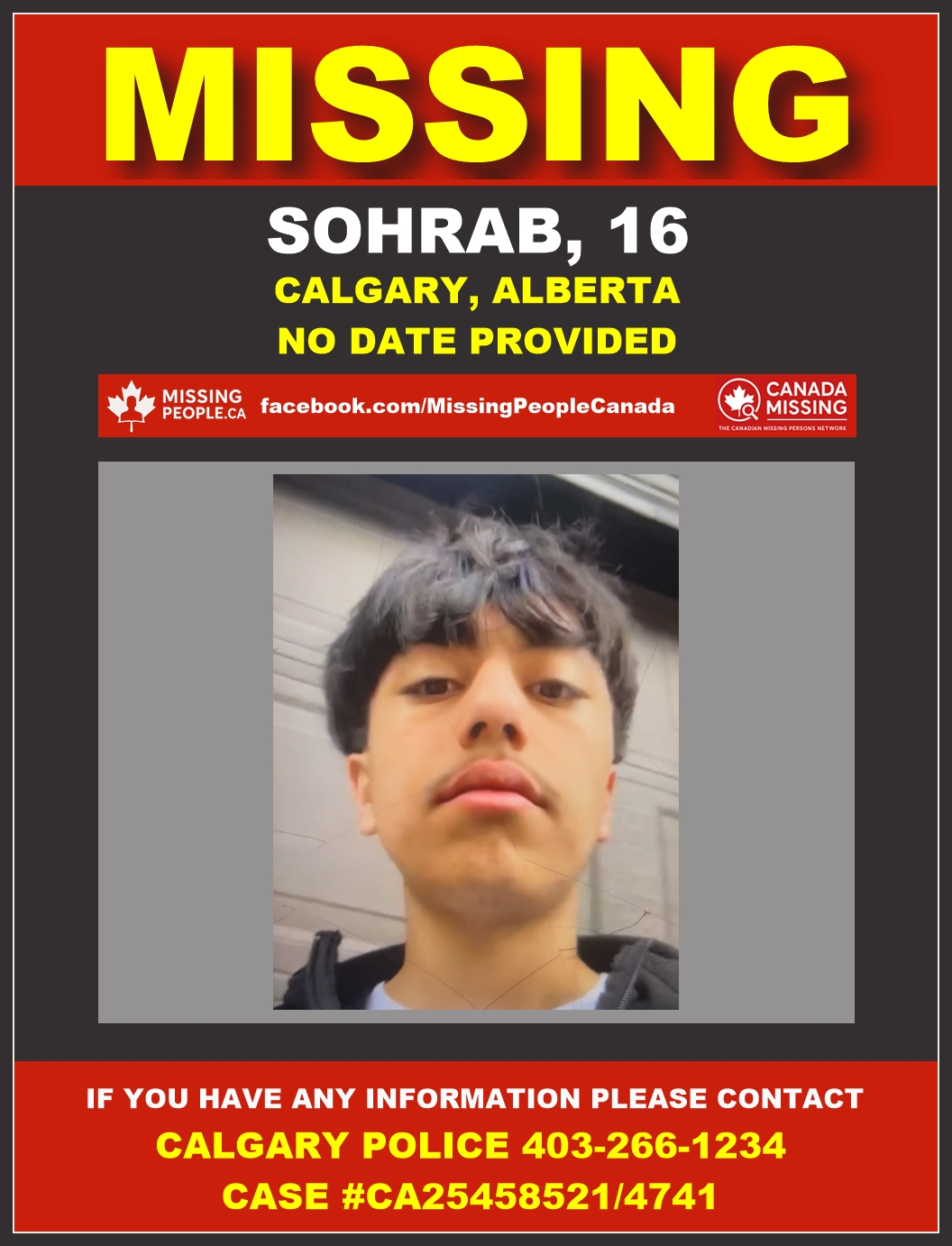 The Calgary Police Service is requesting the public’s assistance in locating Sohrab, a 16-year-old male reported missing from the southwest community of Yorkville.