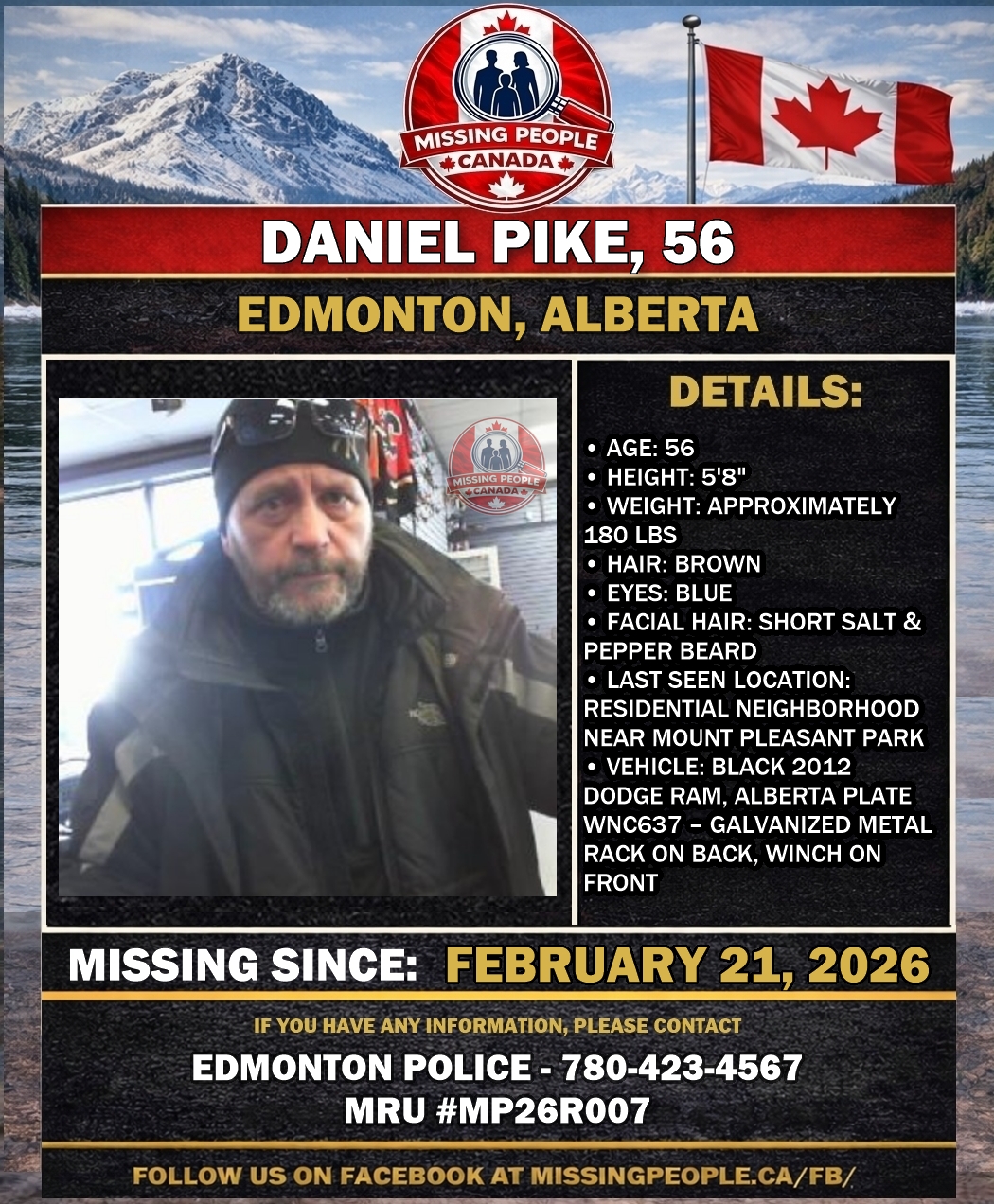 The Edmonton Police Service (EPS) is seeking the public’s assistance in locating a missing 56-year-old man, Daniel Pike. Daniel was last seen on February 21, 2026 in a residential neighborhood near Mount Pleasant Park. At the time he went missing, he was driving a black 2012 Dodge Ram with license plate WNC637. The truck has a galvanized metal rack on the back and a winch on the front. Police are concerned for his well-being.