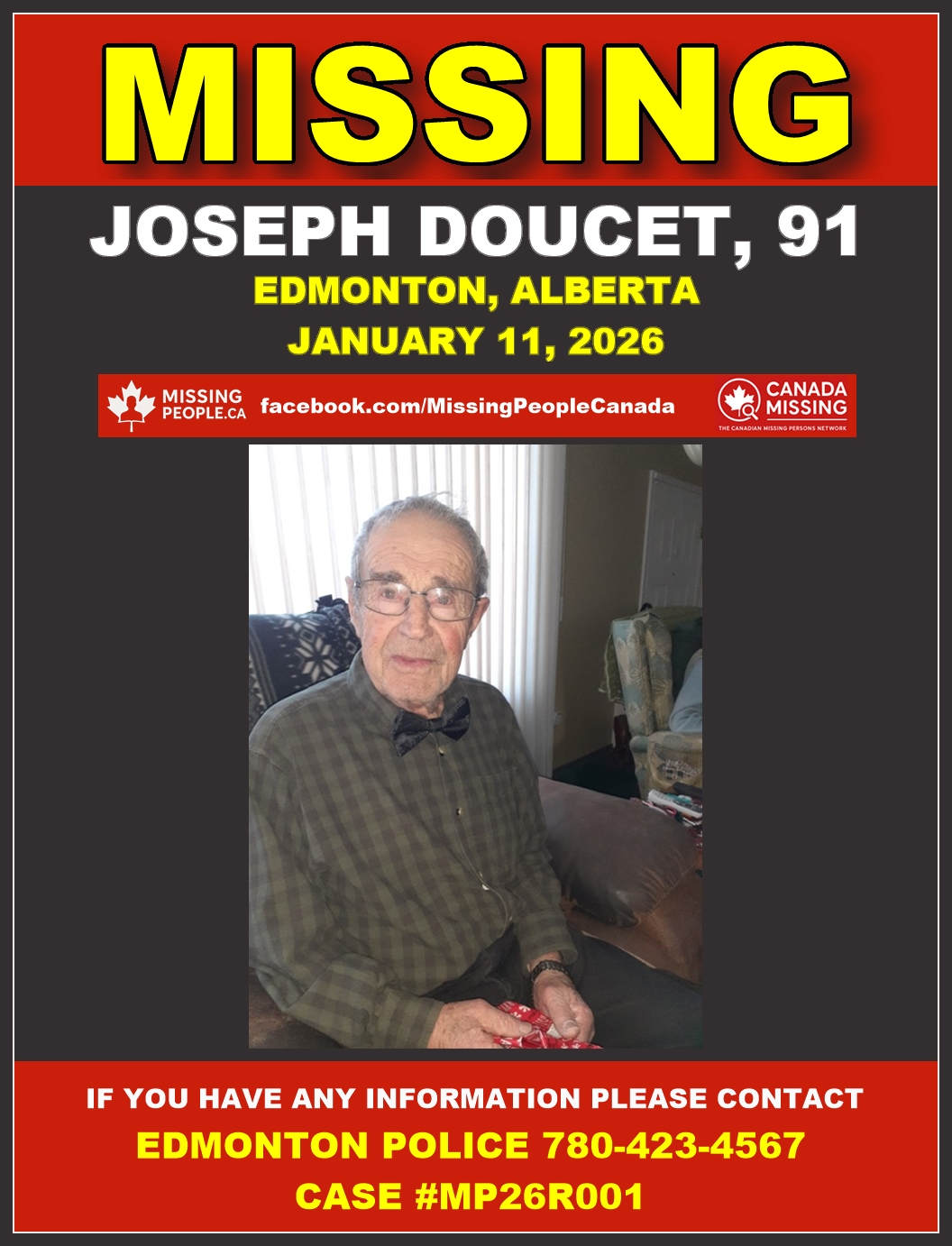 🚨 Missing man in Edmonton, Alberta – Joseph Doucet, 91 – Last Seen January 11 2026
