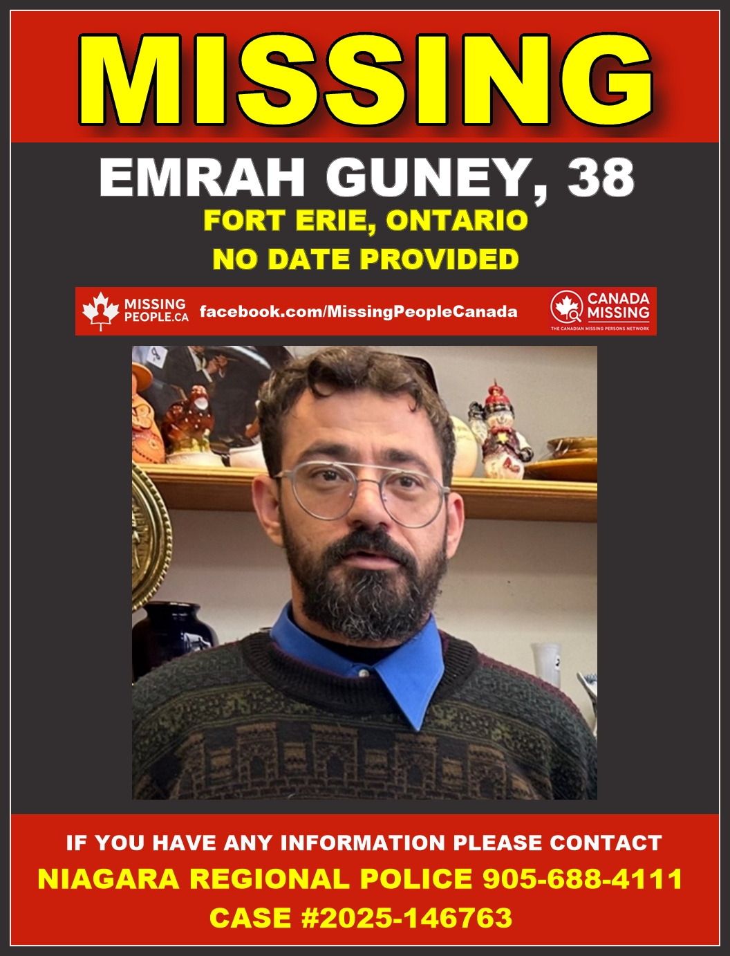 The Niagara Regional Police Service is requesting the public’s assistance in locating Emrah Guney, a 38-year-old white male. Incident 2025-146763.